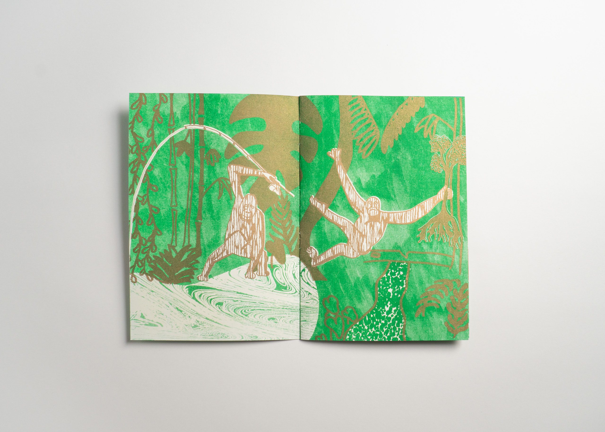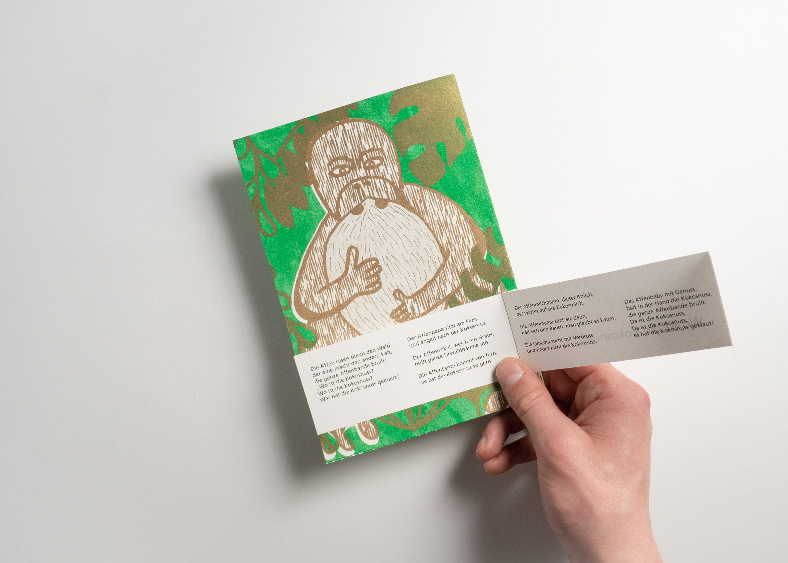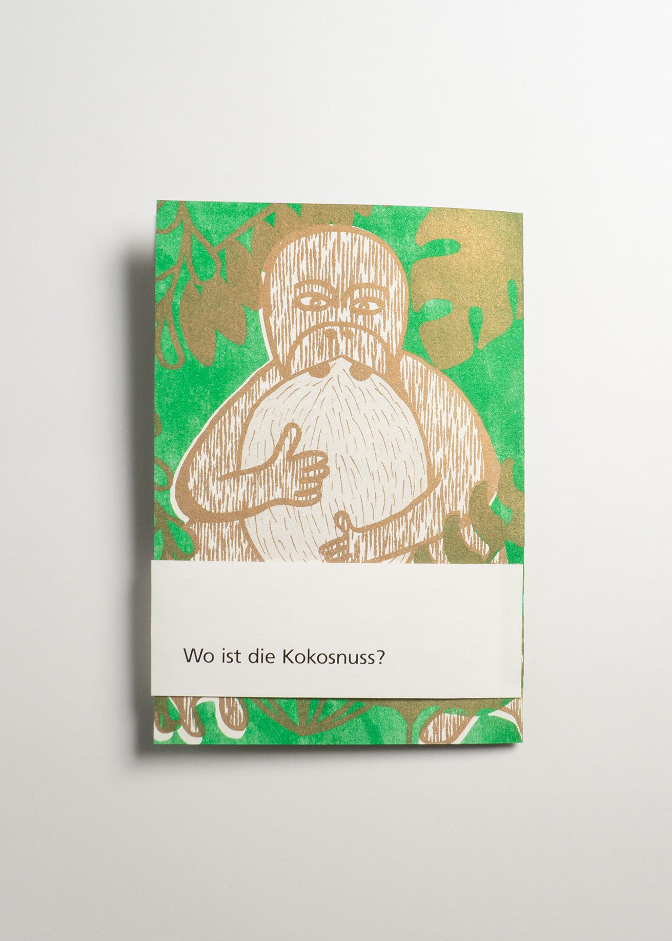 Mit dem RISO Druckverfahren wollte ich eine spielerische Aufmachung des Lieds «Wo ist die Kokosnuss?» gestalten. Wie im Lied war mir wichtig auf der Suche nach der Kokosnuss eine Dramaturgie zu schaffen. Um diese visuell umzusetzen, nutzte ich den Urwald und die Affen. Wie weiter wir in die Geschichte eintauchen, umso dichter wird auch der Urwald um uns herum. Jeder Affe dem wir begegnen, schliesst sich uns an, bis die ganze Affenbande zusammen auf der Suche nach der Kokosnuss ist.