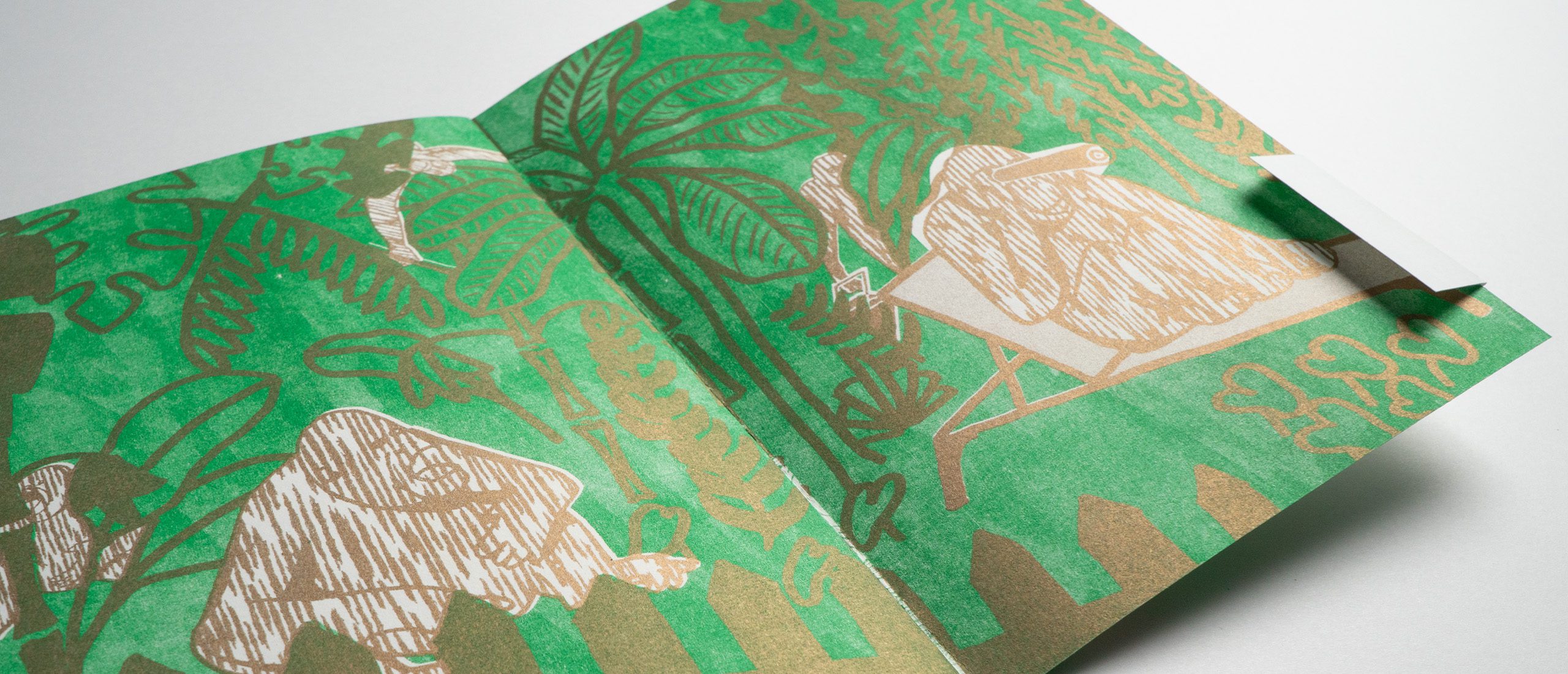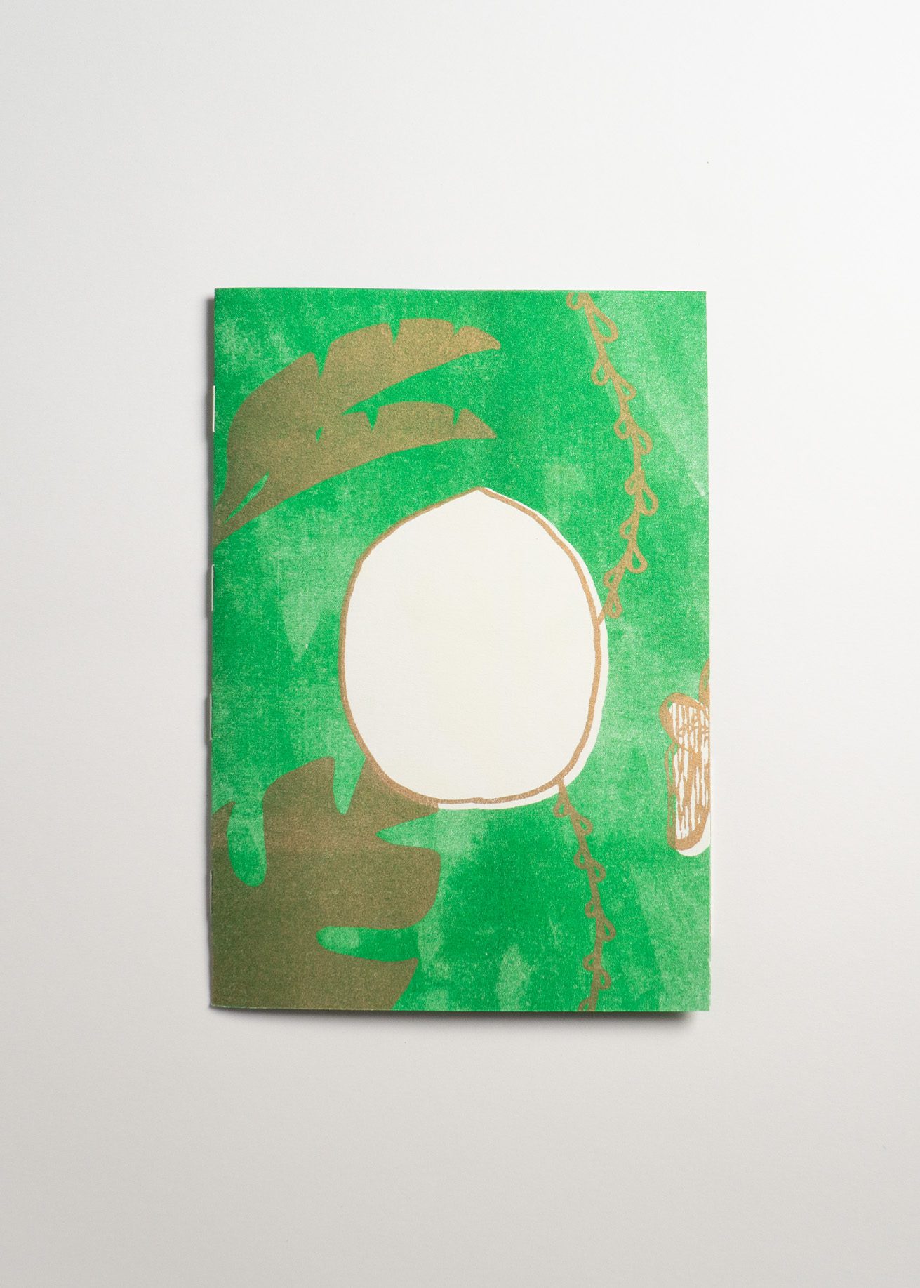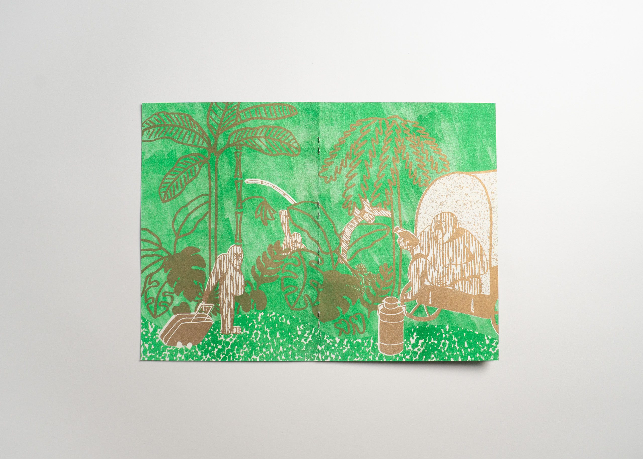 Mit dem RISO Druckverfahren wollte ich eine spielerische Aufmachung des Lieds «Wo ist die Kokosnuss?» gestalten. Wie im Lied war mir wichtig auf der Suche nach der Kokosnuss eine Dramaturgie zu schaffen. Um diese visuell umzusetzen, nutzte ich den Urwald und die Affen. Wie weiter wir in die Geschichte eintauchen, umso dichter wird auch der Urwald um uns herum. Jeder Affe dem wir begegnen, schliesst sich uns an, bis die ganze Affenbande zusammen auf der Suche nach der Kokosnuss ist.